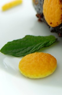 La decoración la he realizado aprovechando la piel de naranja, que he troquelado en  pequeños circulitos los cuales he ido aplicando directamente sobre los costados. Un pequeño brote de hierbabuena es más que suficiente para darle aroma al conjunto. Delicioso de verdad….
