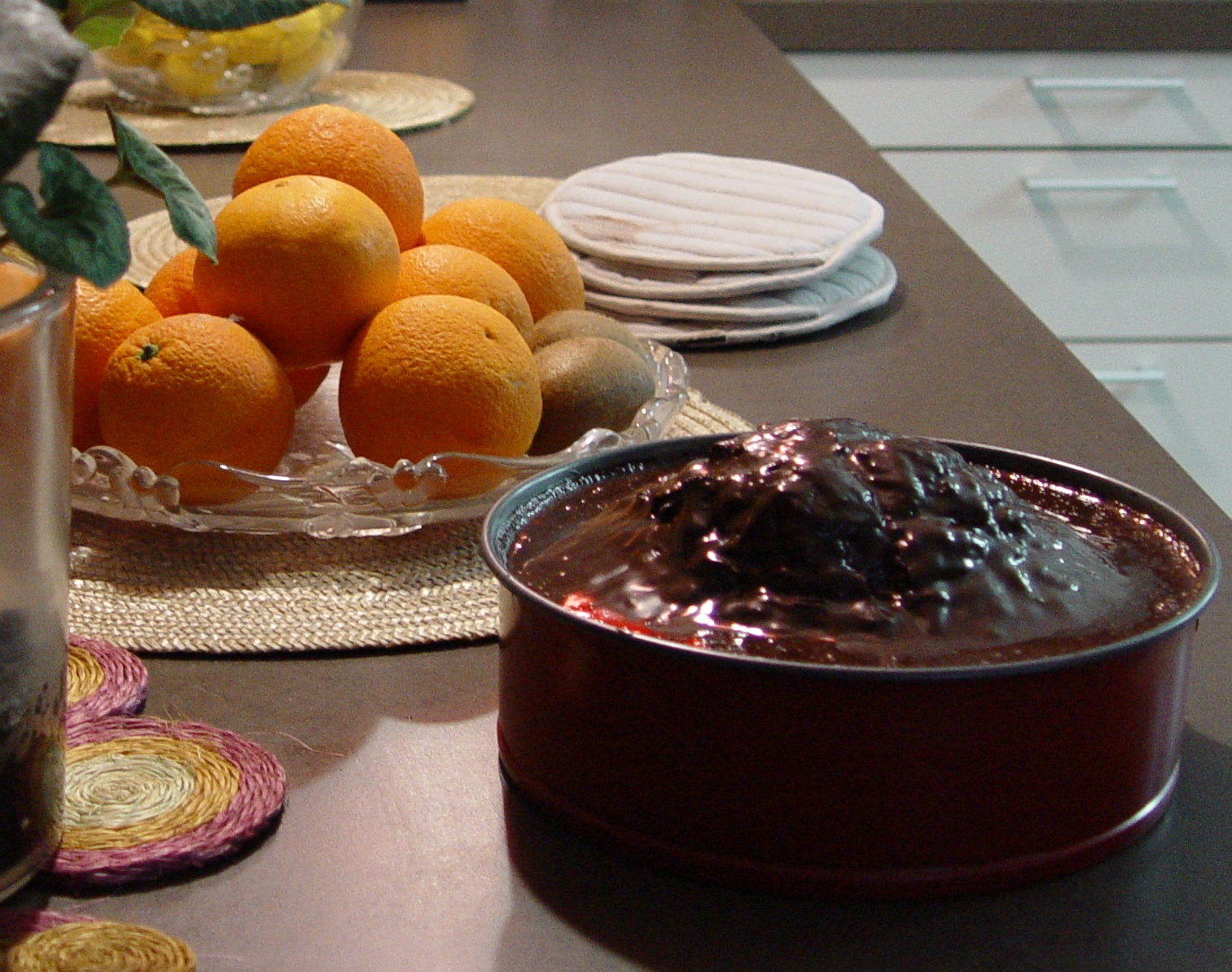 Para hacer la cobertura de chocolate se pone la mantequilla en un cazo y se calienta lentamente hasta que funda por completo, con cuidado de no quemarla. Cuando esté fundida se añade al cacao y al azúcar glasé que ya los tendremos unidos y removeremos bien hasta que quede todo ligado. Sin dejar enfriar del todo se vierte sobre sobre la tarta y se reparte a gusto con una espátula.