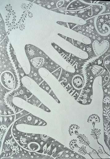 Esta ilustración es muy especial para mi. Son las manos de mi madre y mi hija mayor y es el primer dibujo de una serie donde quiero dibujar las manos de mis preciosas niñas: mi madre y mis dos hijas. Mi madre padece una enfermedad degenerativa muy grave y estos dibujos son para mi como si pudiera conservar una parte de ella.