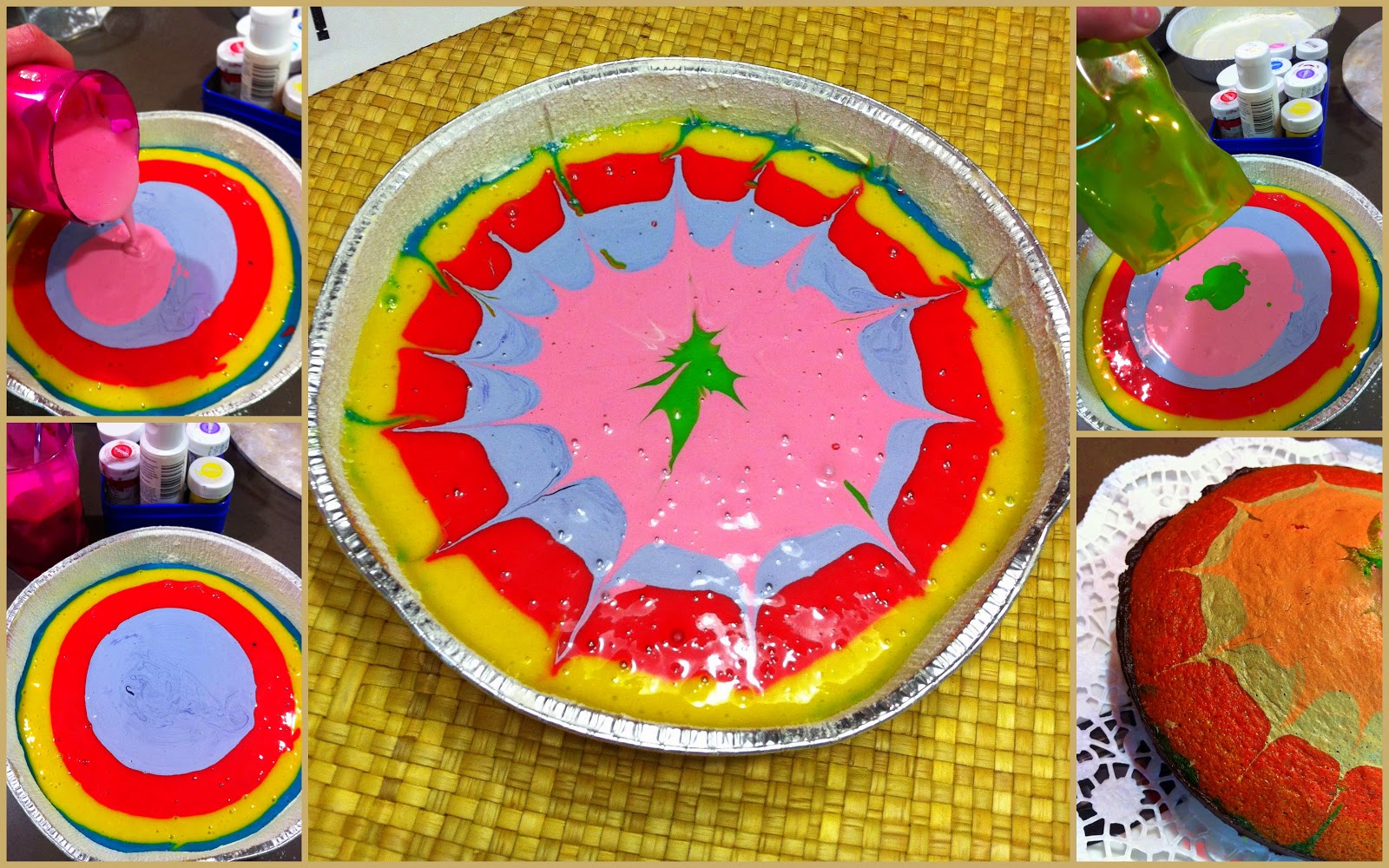 En el molde se echa primero un color y a continuación y en el centro del mismo se incorpora con suavidad otro, y así sucesivamente d emanera que no se mezclan y quedan homogéneamente extendidos.