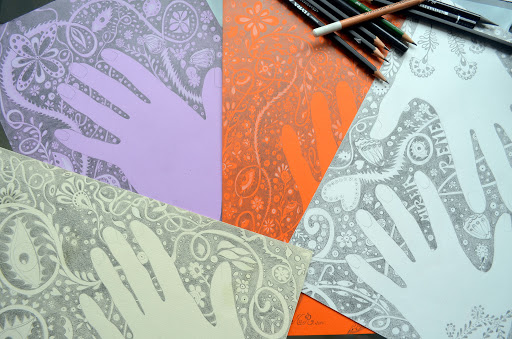 Estas son algunas de las manos mágicas que he dibujado últimamente. Se tratan de dibujos realizados contorneando mi mano a lápiz y que luego he acabados con lápiz, o con tinta. he dibujado mis manos y las manos de mi madre y mis hijas sobre diferentes hojas de colores.
