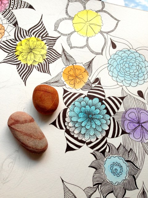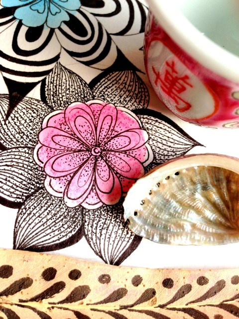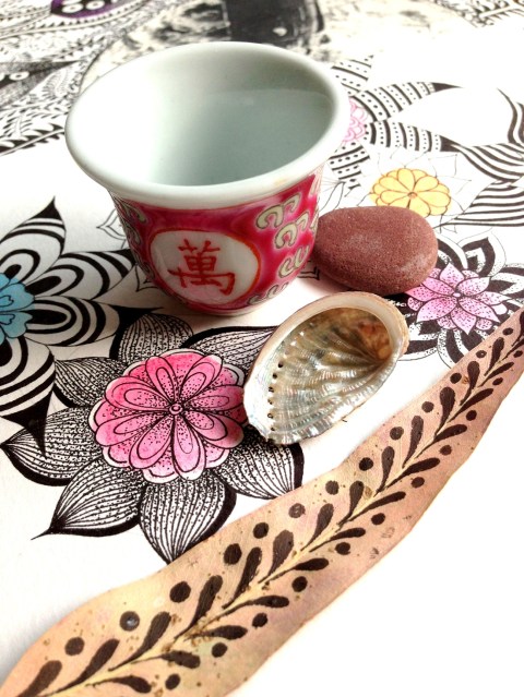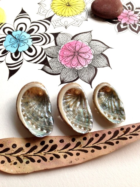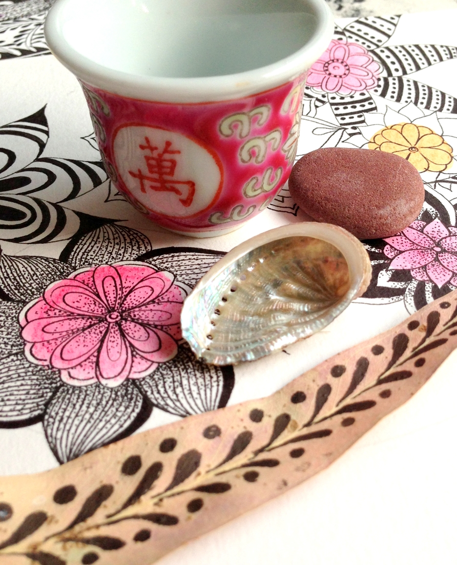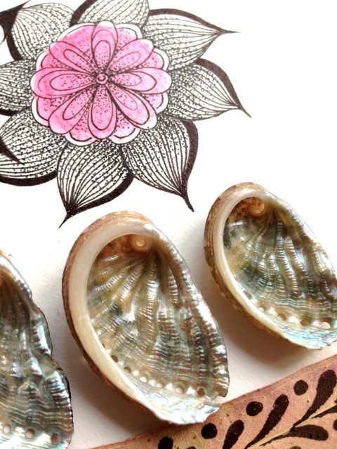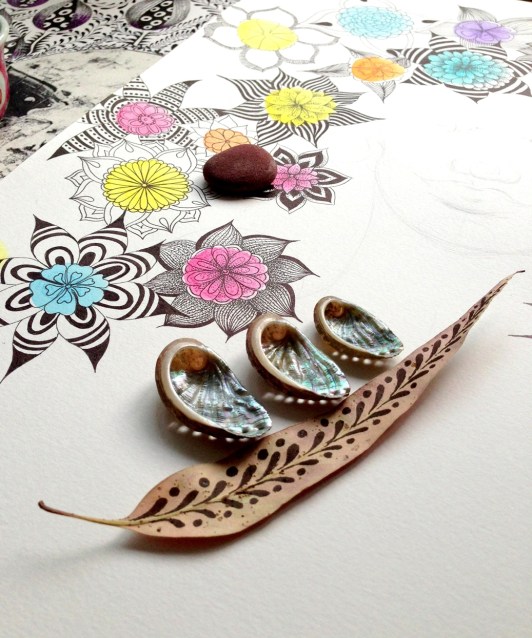 Lo he pasado realmente bien pintando y fotografiando esta serie. Aún no está acabado pues es muy laborioso pero no me he podido resistir a hacer una primera sesión de fotos con pequeños complementos: conchas del mediterráneo, piedras y flores que he recogido en mi jardín.