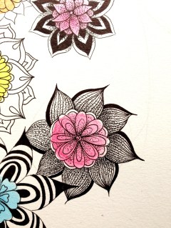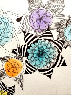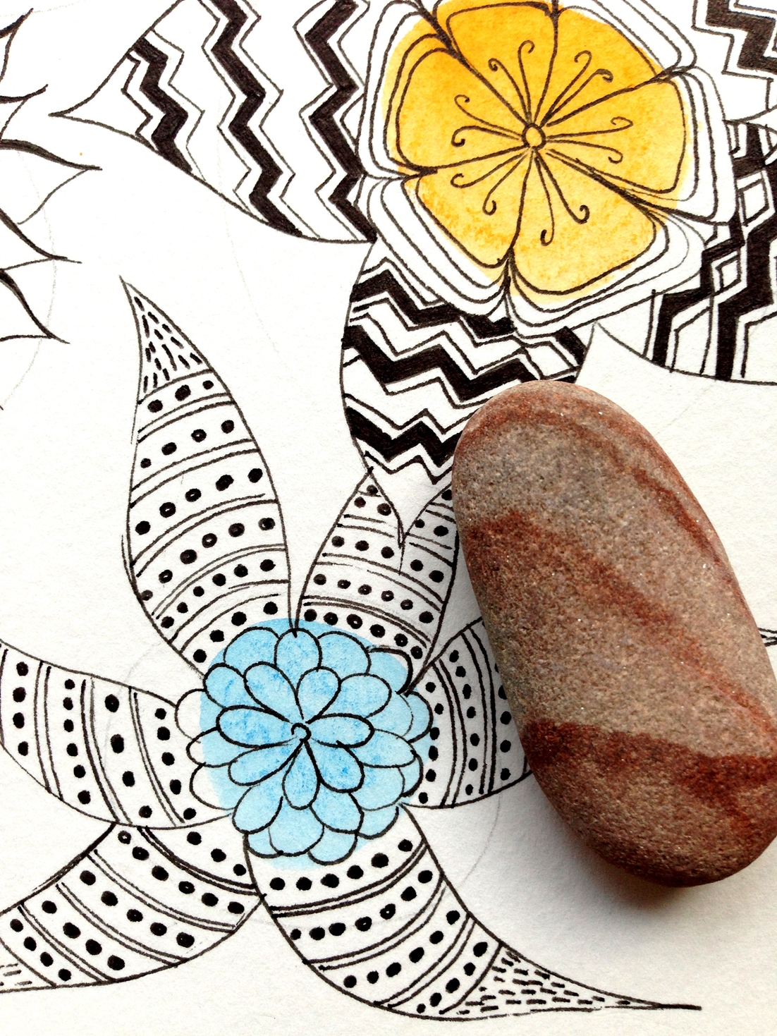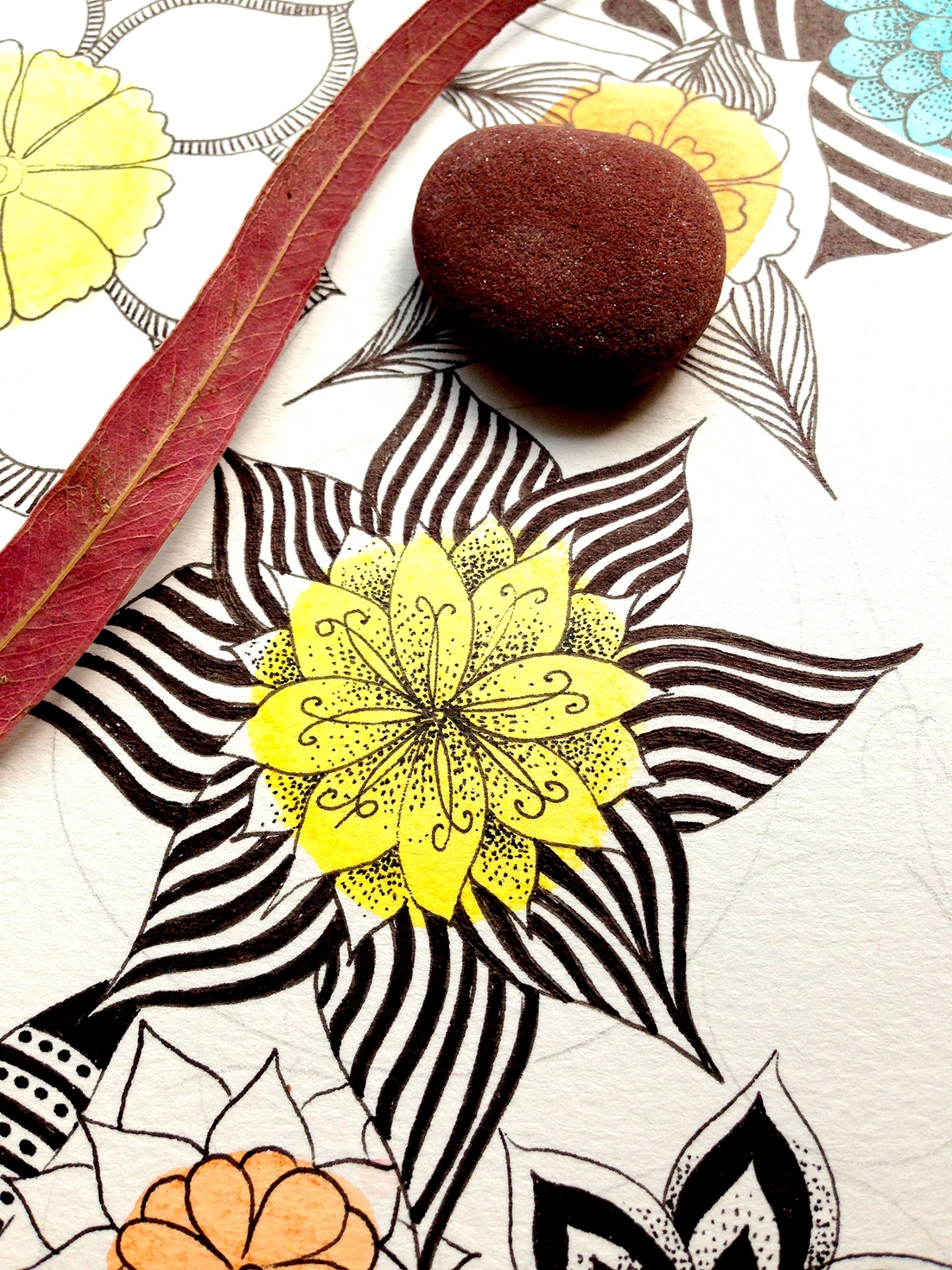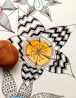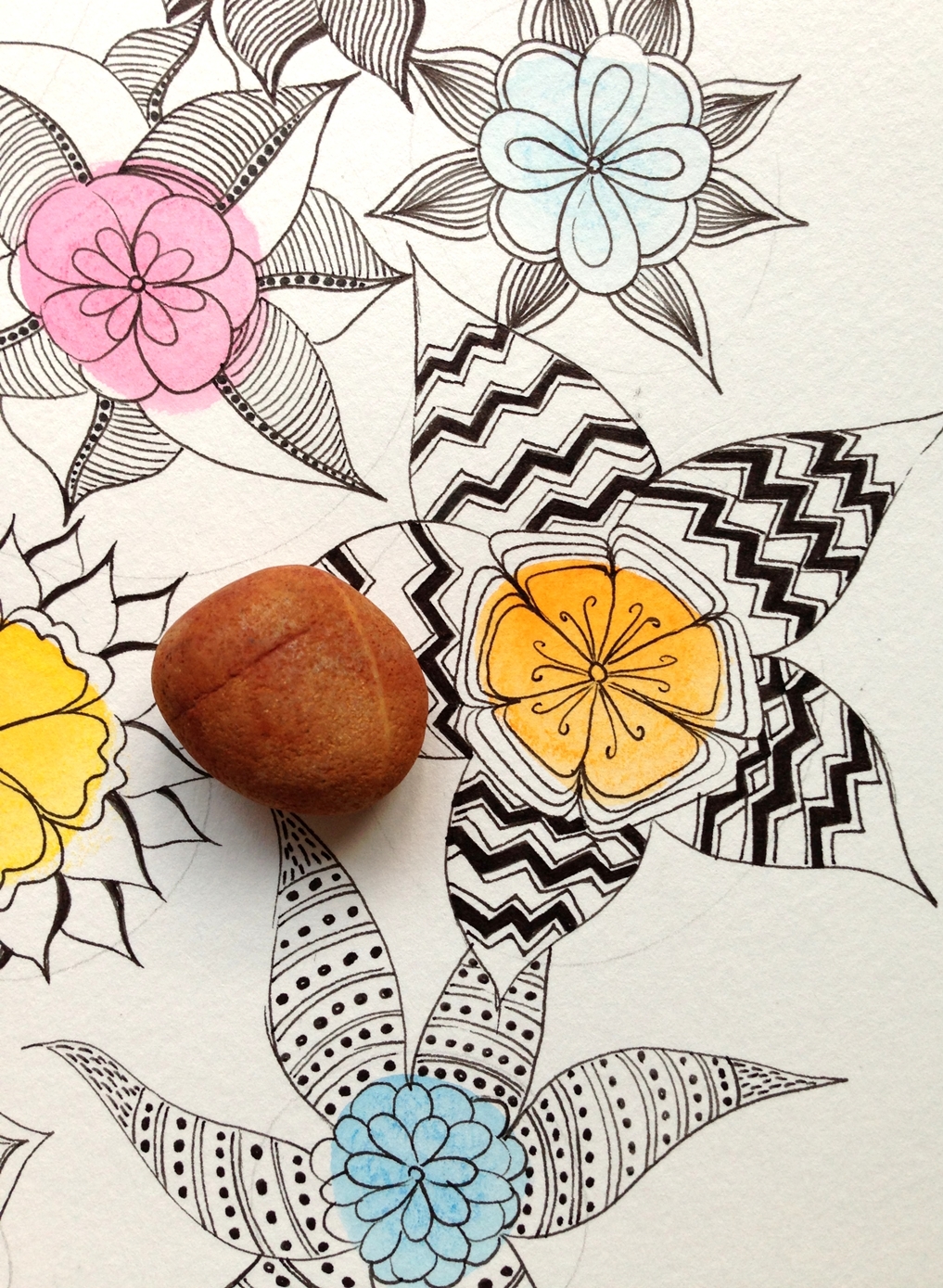 Lo he pasado realmente bien pintando y fotografiando esta serie. Aún no está acabado pues es muy laborioso pero no me he podido resistir a hacer una primera sesión de fotos con pequeños complementos: conchas del mediterráneo, piedras y flores que he recogido en mi jardín.