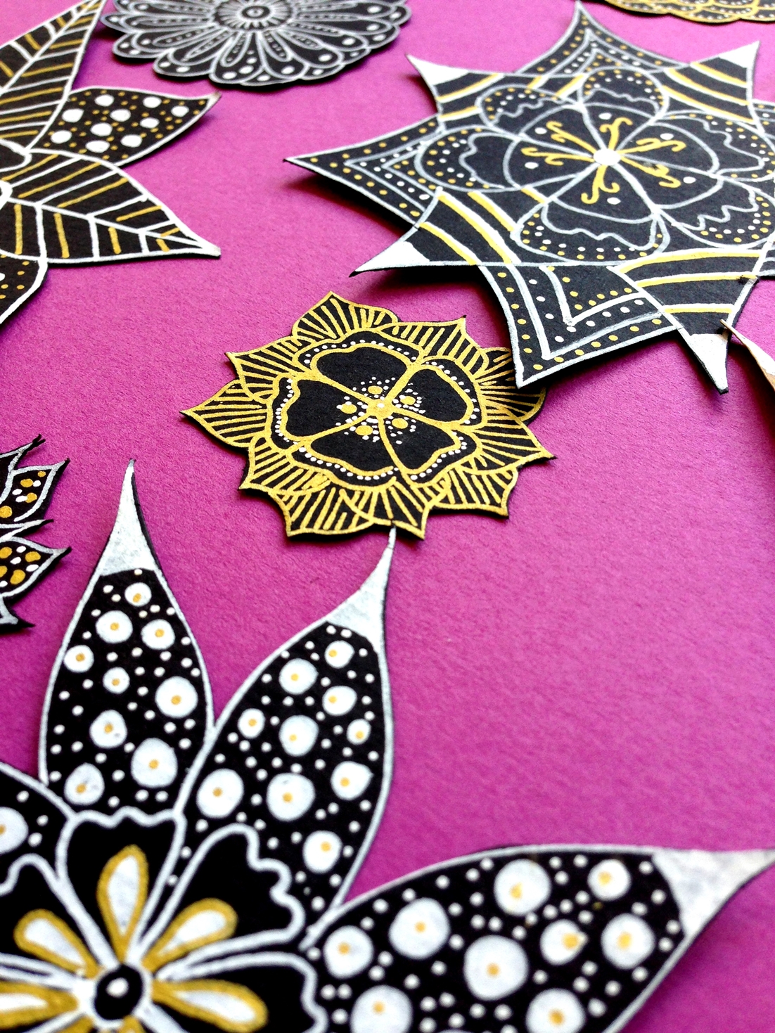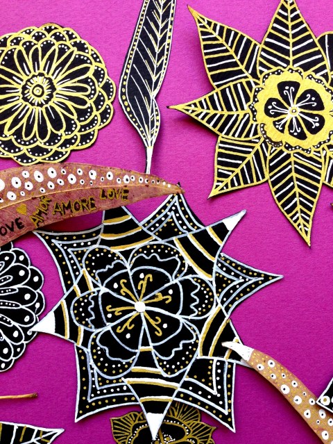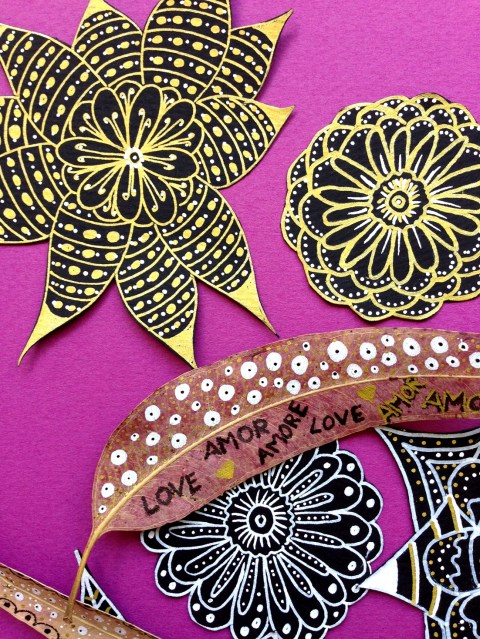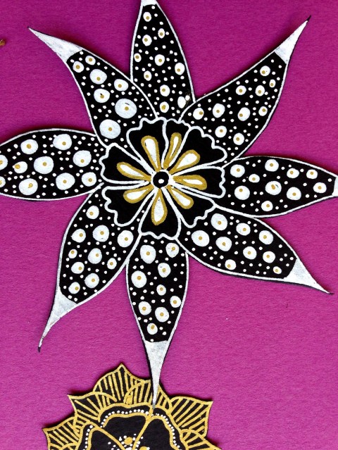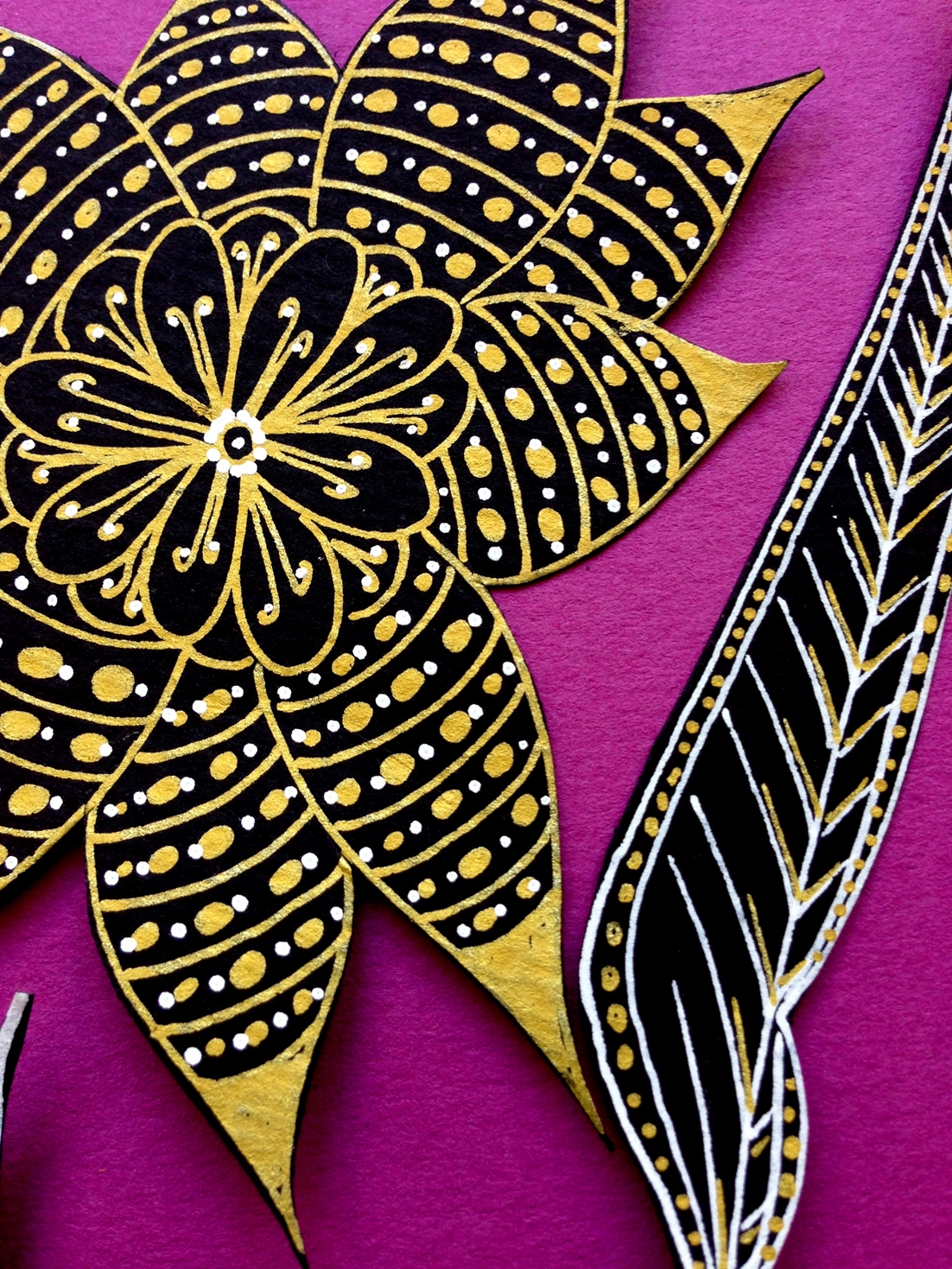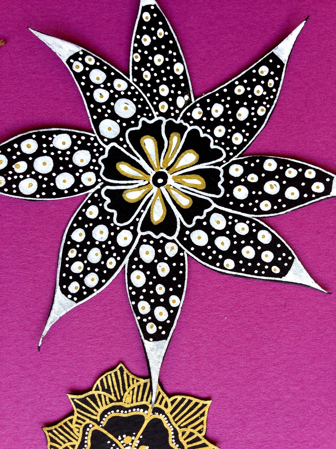 It was a very busy night my little and I slept very late drawing, cutting and painting all these flowers. Now we’re playing with them, photographing them on different backgrounds and colors. Very, very funny.