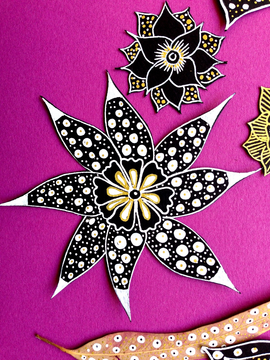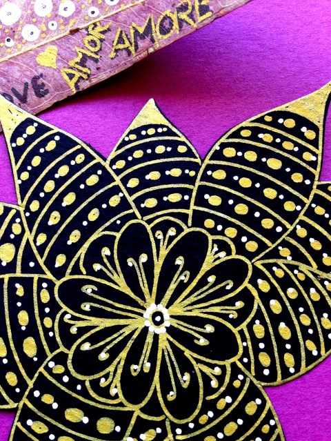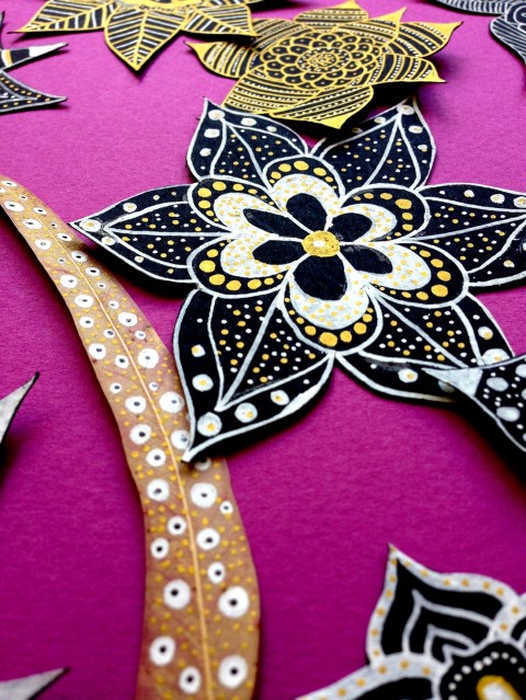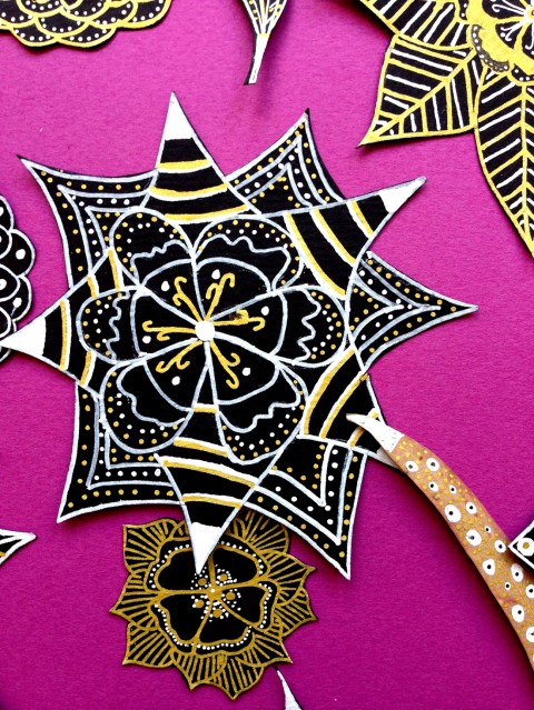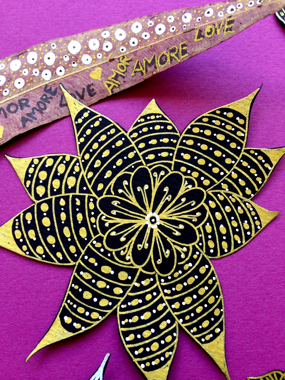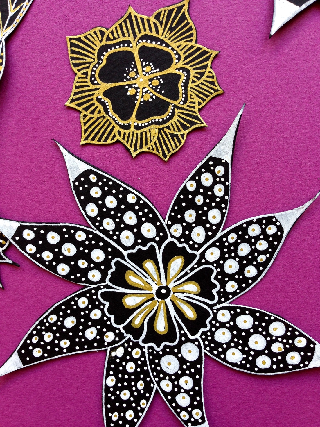 It was a very busy night my little and I slept very late drawing, cutting and painting all these flowers. Now we’re playing with them, photographing them on different backgrounds and colors. Very, very funny.