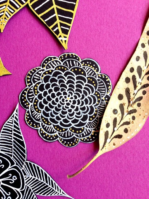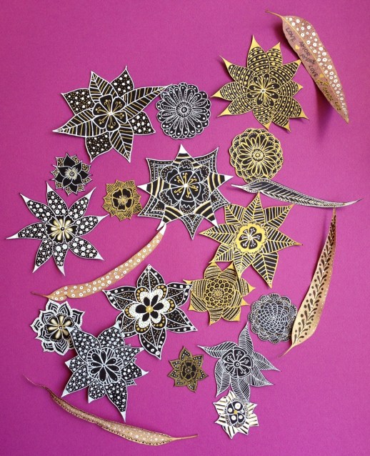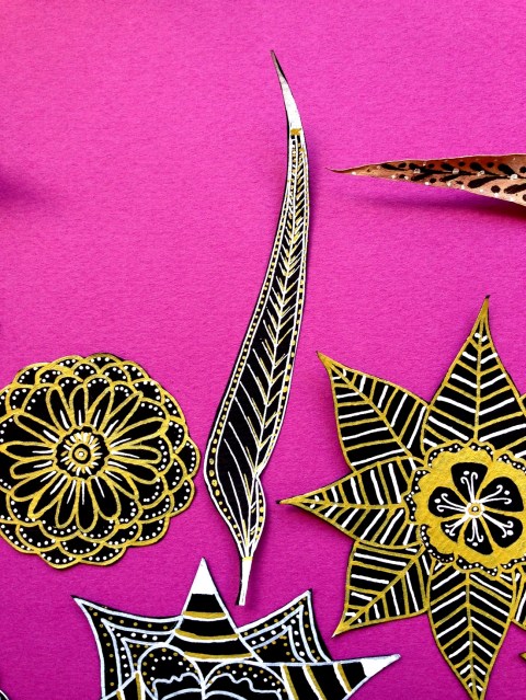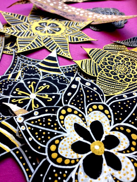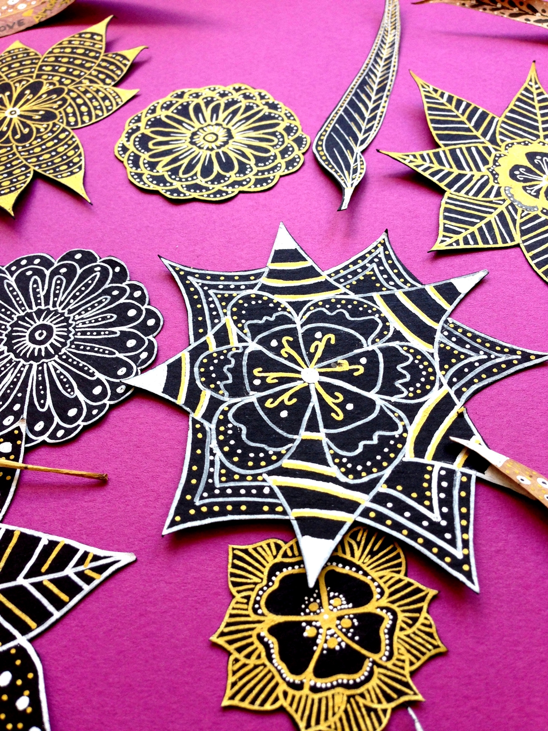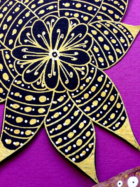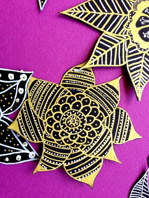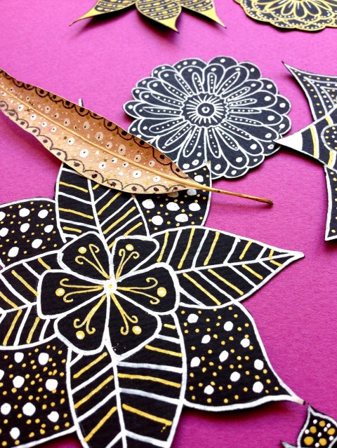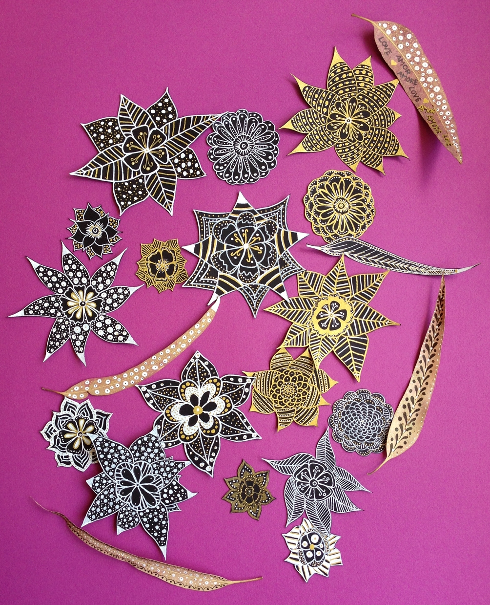 It was a very busy night my little and I slept very late drawing, cutting and painting all these flowers. Now we’re playing with them, photographing them on different backgrounds and colors. Very, very funny.