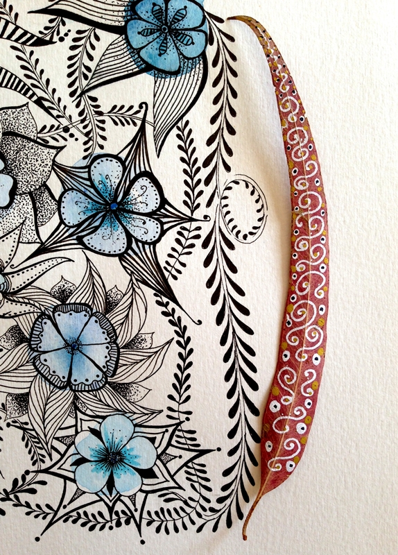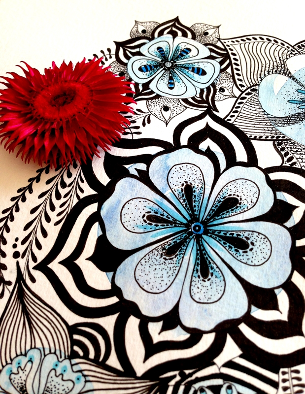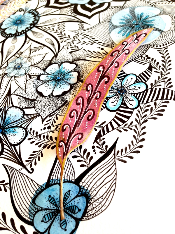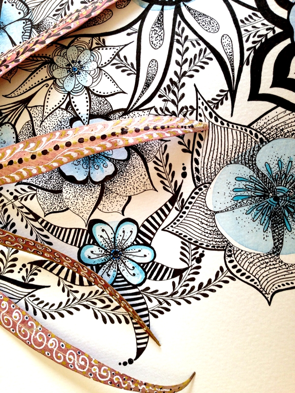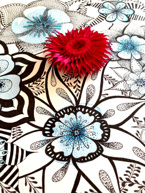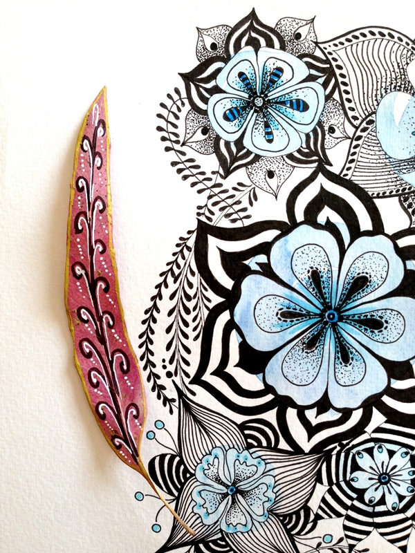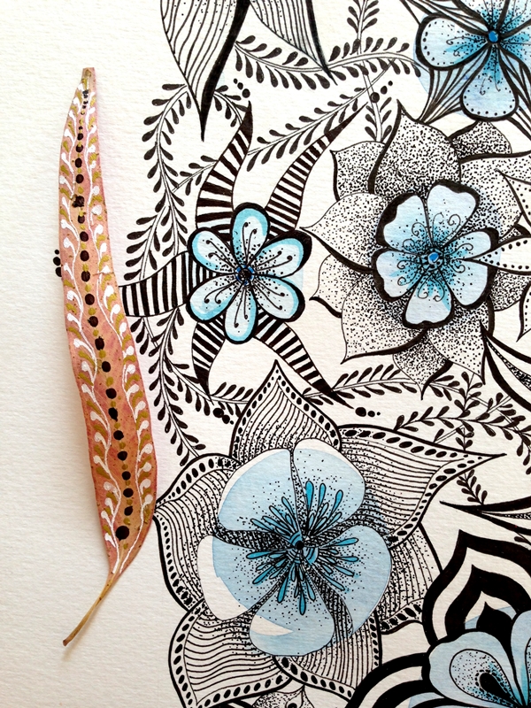 Cuando una está inspirada que bien se pasa. Me ha llegado el subidón creativo y he empezado a hacer fotos con mi cámara y no ha habido qjuien me parara. He combinado una ilustración de tinta negra y acuarela con diferentes complementos, hojas, flores y creo que la combinación queda preciosa y elegante.