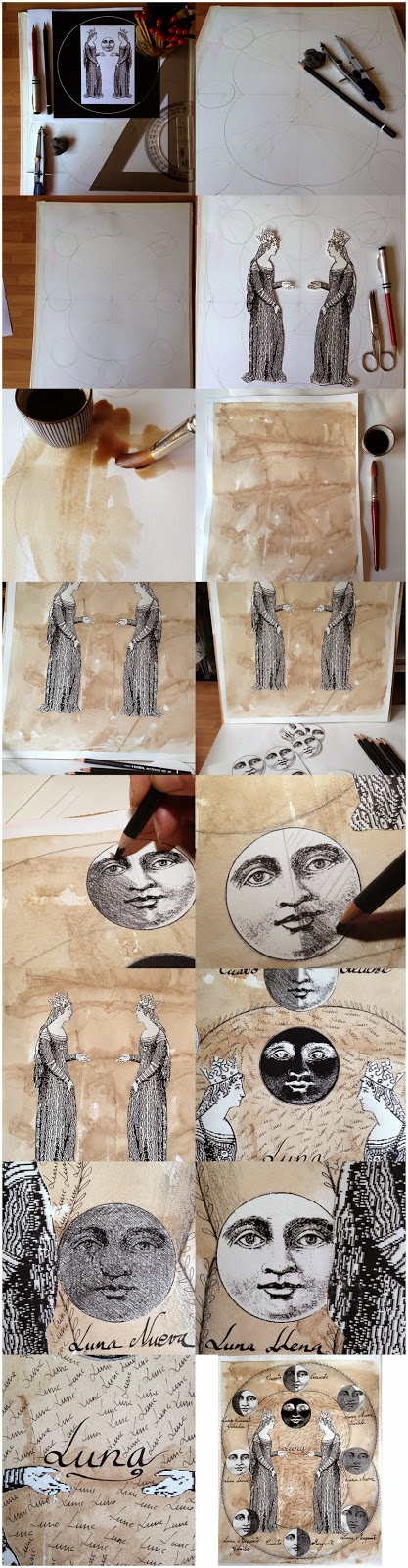 I just started a course through internet on art and creativity and I’m really hooked on it. it is the Full Circle Workshop, taught by an American artist, Misty Mawn. This is the first job and tries to start breaking on hand dyed papers. I chose my papers dyed with walnut stain and I work collage and ink drawing. I am very inspired, and I have put up the whole process that I followed through if you are interested in knowing.