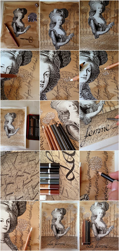 With this latest illustration I completed my first year of the course Full Circle on line workshop. They are twelve weeks of creativity and at this rate I’ll never finish the first week, because even some of the first few years left me. Well really what matters is having a good time and here I. This drawing is worked with a walnut stain base with which I dyed the paper and then a collage of a French lady of the eighteenth century. It’s really pretty and gorgeous elegance of the staging and was intrigued saw her. I have worked with pencils and chalk pastel gray and black colors and sanguine with ink pens and my pen for calligraphy. The result has left me very satisfied and I can not wait to put it in my portfolio. Happy week and see you soon