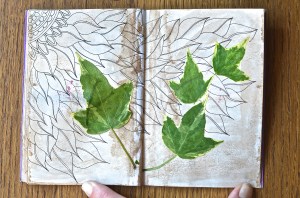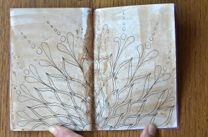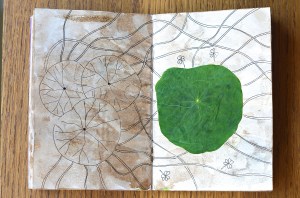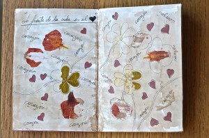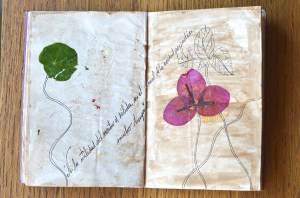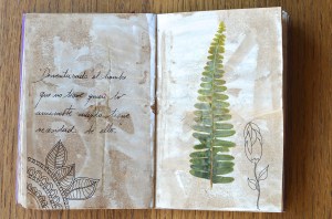 La desmonté y tinté las hojas con nogalina y a continuación fui estampando plantas y flores desecadas y fui insertando breves textos de algunas de sus obras escritas.