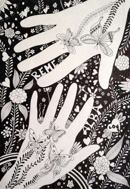 Esta semana he retomado un dibujo que tenía aparcado desde hace algunos meses y que quería acabar ya de una vez. Es una ilustración en la que quedan plasmadas las manos izquierdas de mi madre,70 años, y mi hija pequeña, 14 años. La enfermedad de mi madre sigue avanzando y gestos que habitualmente se hacen sin darse cuenta para ella supone un imposible y hay que ayudarla en todo. esta ilustración es una visión alegre y optimista de la relación entre una nieta y su abuela. Quiero que Alba tenga esta ilustración para que tenga un recuerdo bonito de su abuela el día que ya no esté.